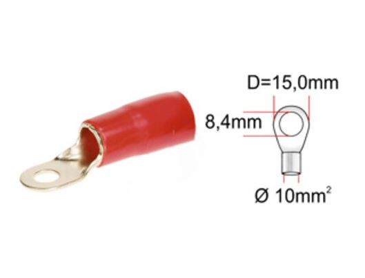 Kabelové očko 10 qmm s izolací pro napájecí kabeláž, díra 8,4 mm, červená izolace