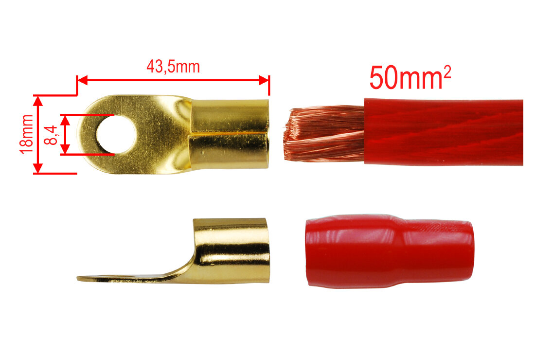 Kabelové očko 50 qmm s izolací pro napájecí kabeláž, díra 8,4 mm, červená izolace