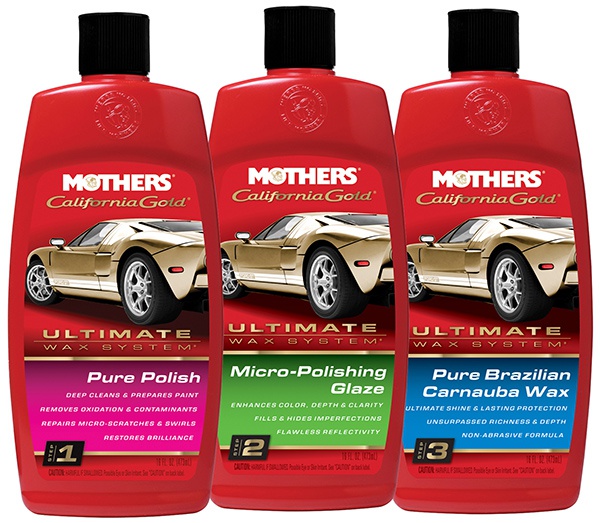 Mothers Ultimate Wax System - revoluční třífázový systém péče o lak v akčním setu. Mothers California Gold Pure Polish - čistící leštěnka, 473 ml (krok 1) + Mothers California Gold Micro-Polishing Glaze - ultra jemná leštící pasta, 473 ml (krok 2) + Mothers California Gold Pure Brazilian Carnauba Wax - karnaubský vosk tekutý, 473 ml (krok 3).