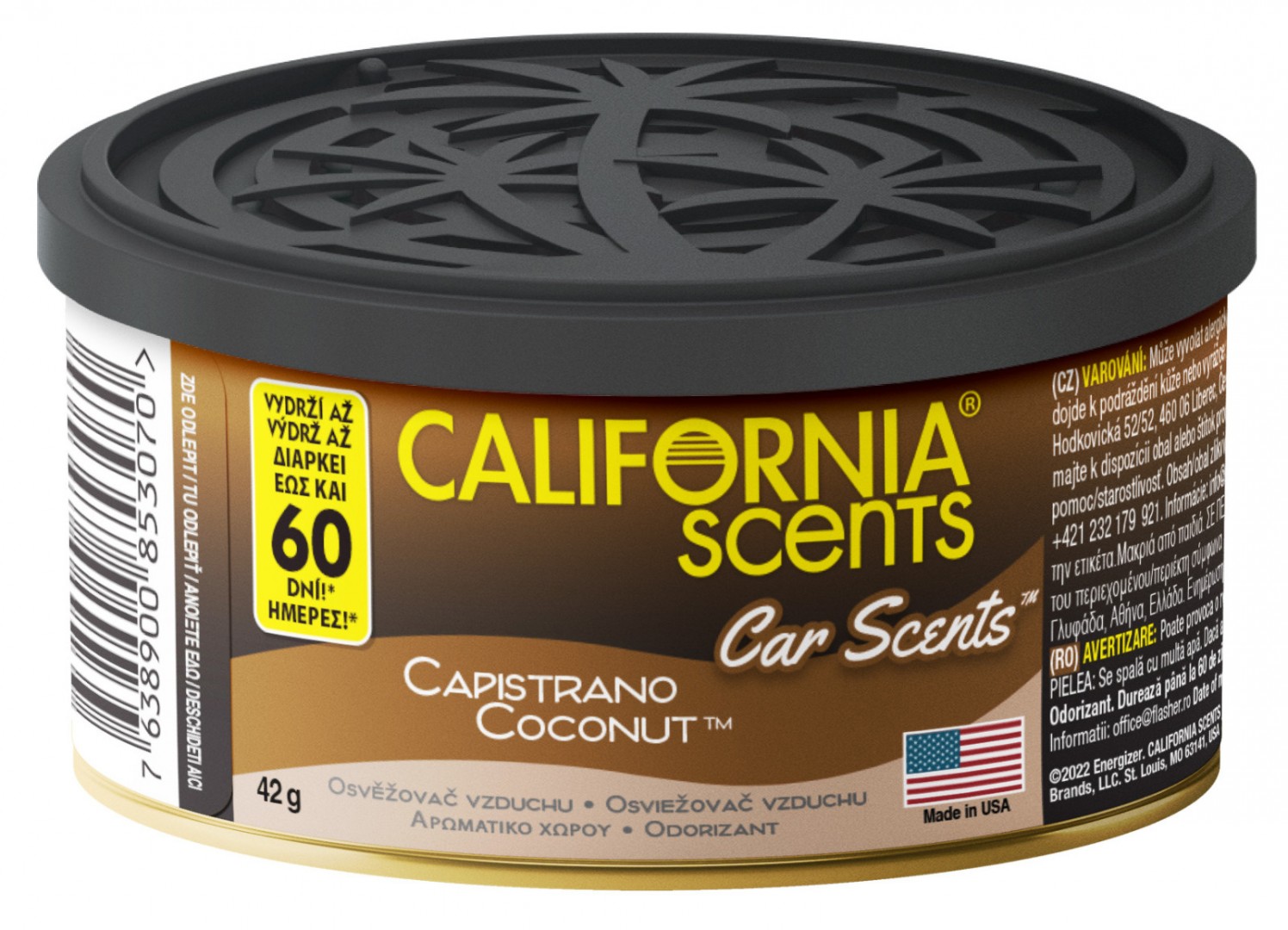 Luxusní, smyslné, trvanlivé a intenzivní vůně do auta California Scents jsou tu aby vám dokázaly, co znamená opravdu dlouhotrvající přijemná vůně ať už ve vašem voze, domácnosti nebo kanceláři. Každá plechová dóza Car Scents® obsahuje tři bloky lisovaného lnu napuštěného parfémem. Vzhledem k pevné konzistenci osvěžovače California Scents tak nehrozí únik tekutiny následovaný nepříjemným poleptáním plasotvého povrchu . V neposlední řadě je třeba zmínit, že tyto produkty California Scents jsou velmi šetrné k životnímu prostředí. Obal je tvořen recyklovatelným hliníkem a obsah (lněné bloky) je pak díky svému přírodnímu původu plně biologicky odbouratelný.