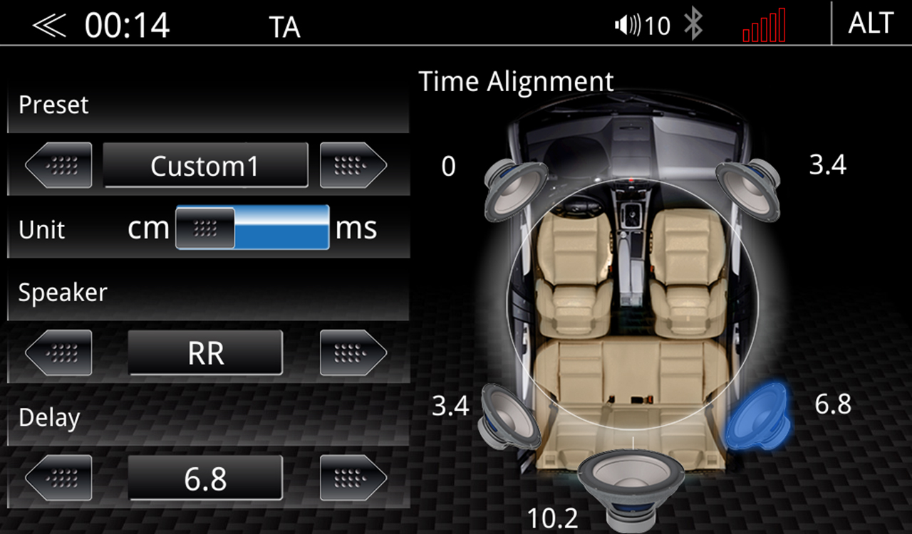 • Časové vyrovnání 5 kanálů prostřednictvím audio DSP se zpožděním až 20 ms pro každý kanál