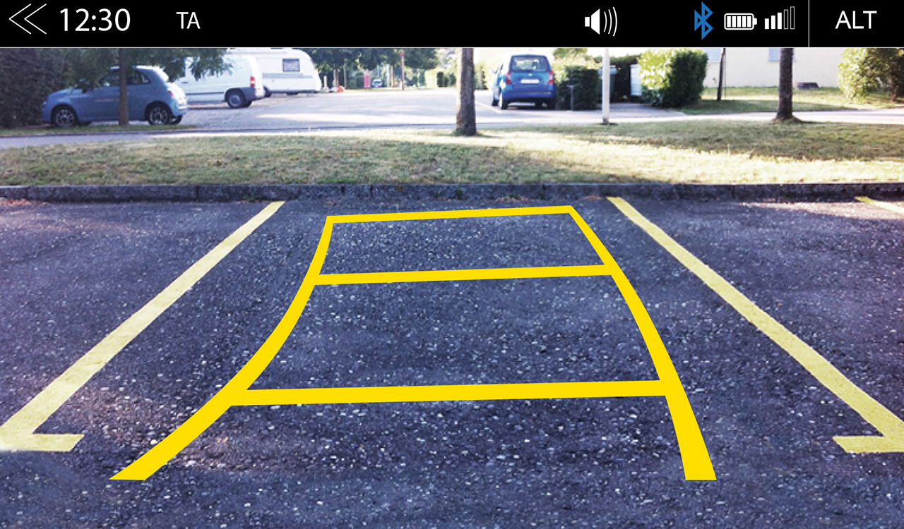 • Vstup pro kamerový systém založený na signálu CVBS (OE) s indikací směru jízdy pomocí dynamických vodicích čar a funkcí automatického přepínání, podpora dodatečně instalovaného kamerového systému se signálem AHD*2