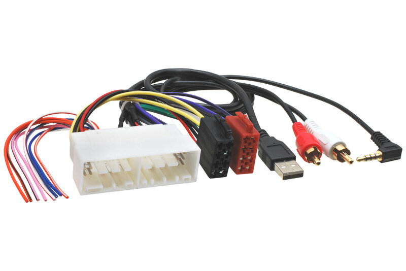 Adaptér obsahuje konektor USB 2x CINCH, 1-pólový JACK konektor a volné vodiče na propojení originálního USB/AUX vstupu s novým autorádiem, pokud to přístroj umožňuje.