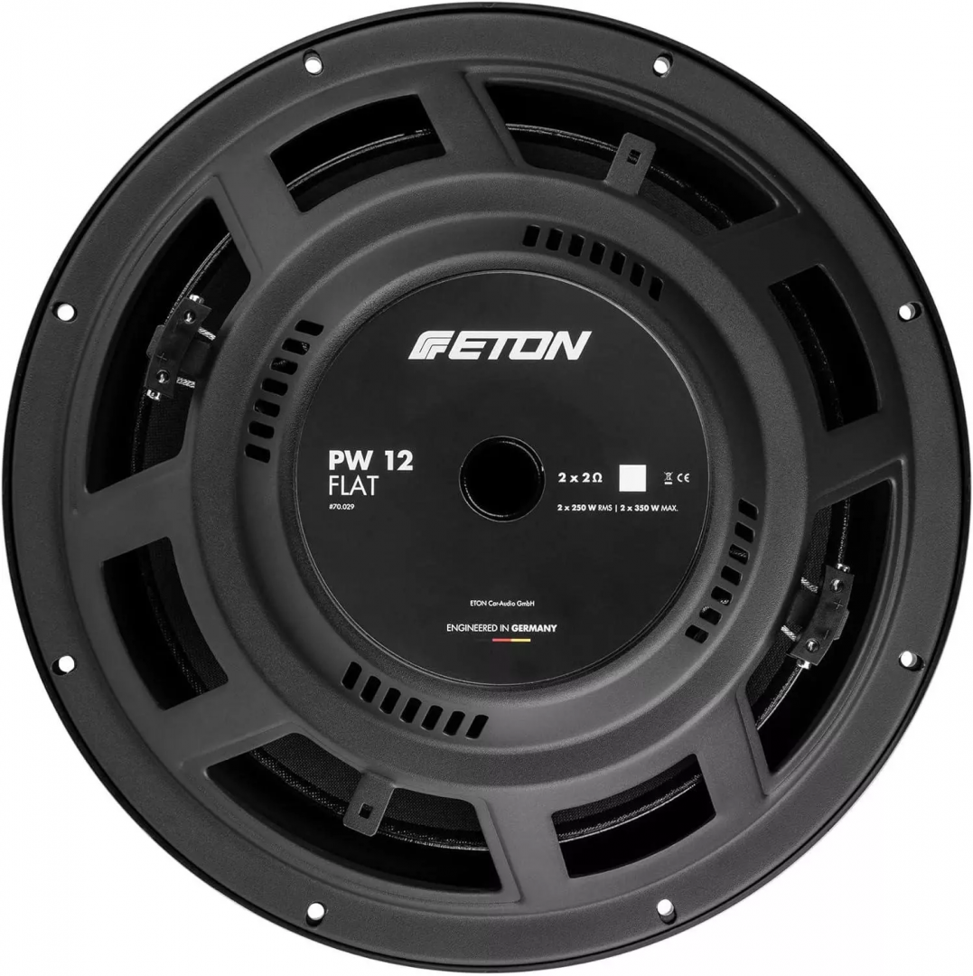 Plochý, kmitavý: Díky instalační hloubce pouhých 85 mm nebo 95 mm patří reproduktory ETON k nejplošším basovým reproduktorům ve své třídě – umožňuje to jejich geniální konstrukce. Subwoofery PW FLAT se proto navzdory velkým feritovým magnetům instalují velmi snadno. Univerzálně použitelné šasi subwooferu lze