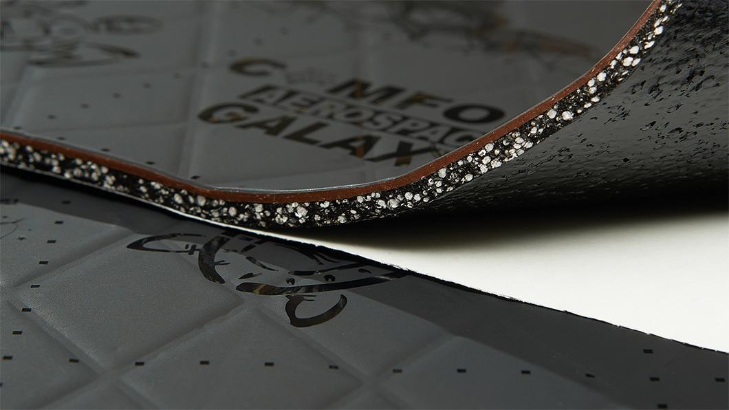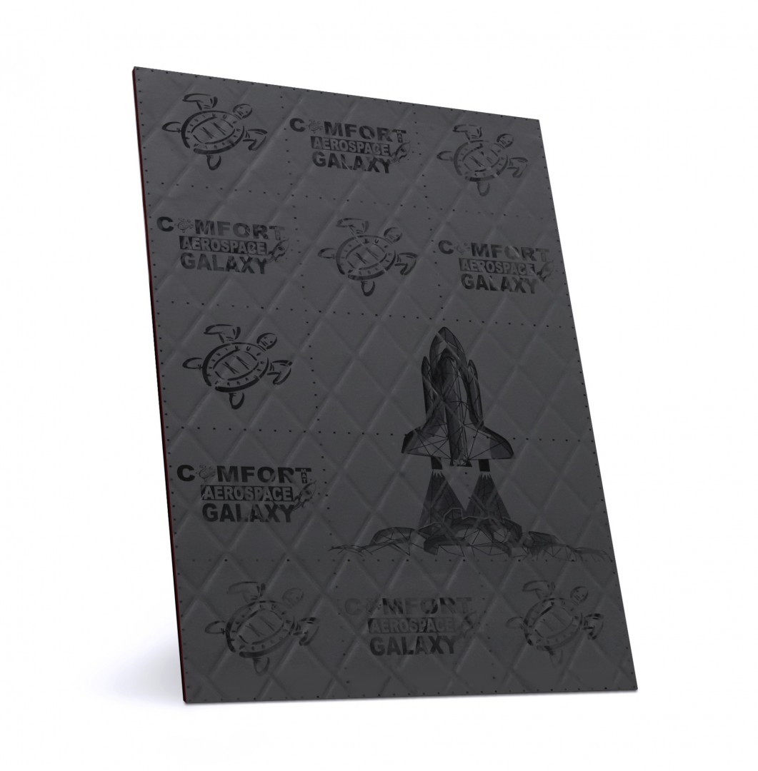 Comfortmat Galaxy je vícevrstvý vibroakustický materiál z pokročilé řady Aerospace, která propojuje účinné antivibrační vlastnosti s pokročilou schopností zvukové izolace. Kombinuje moderní vibroakustickou směs se zpěněnými granulemi, zvukově izolační membránu o tloušťce 2 mm a pevnou hliníkovou fólii Scale One s matným povrchem. Díky této kombinaci zajišťuje Galaxy v jediné vrstvě výrazné omezení vibrací i prostupu hluku karoserií, a to s vynikající mechanickou stabilitou. Galaxy dosahuje akustického ztrátového činitele (MLF) 0,56 a navíc přináší výrazné zlepšení zvukové izolace. Díky své konstrukci současně omezuje rezonance a přispívá ke zvýšení tuhosti velkých karosářských ploch. To Galaxy předurčuje pro aplikace s vysokými nároky na útlum vibrací i hluku – především na podlahu, zadní podběhy nebo středový tunel, ale vhodný je také do dveří, kde je vyžadováno výrazné zlepšení akustického komfortu v jediné vrstvě. Galaxy díky vysoké adhezní pevnosti okolo 13 N/cm zůstává pevně přilnutý i v náročných podmínkách. Plošná hmotnost 6,90 kg/m² představuje úsporu o 30 až 40 % ve srovnání s tradičními dvouvrstvými aplikacemi, což je zásadní především při odhlučnění elektromobilů, sportovních vozů a všude tam, kde je nízká hmotnost použitých materiálů prioritou.