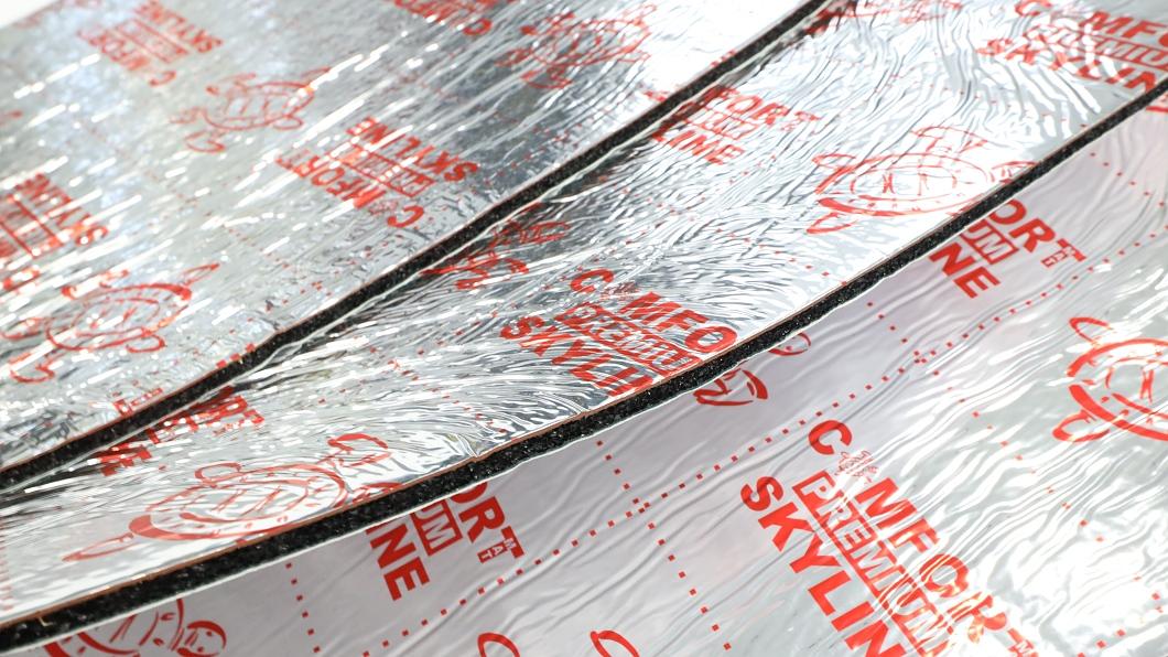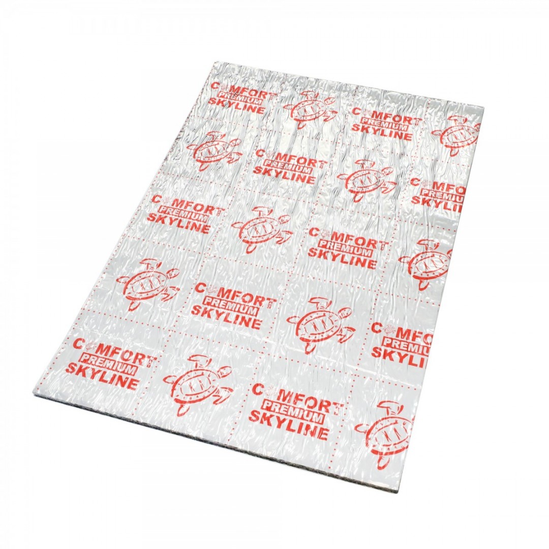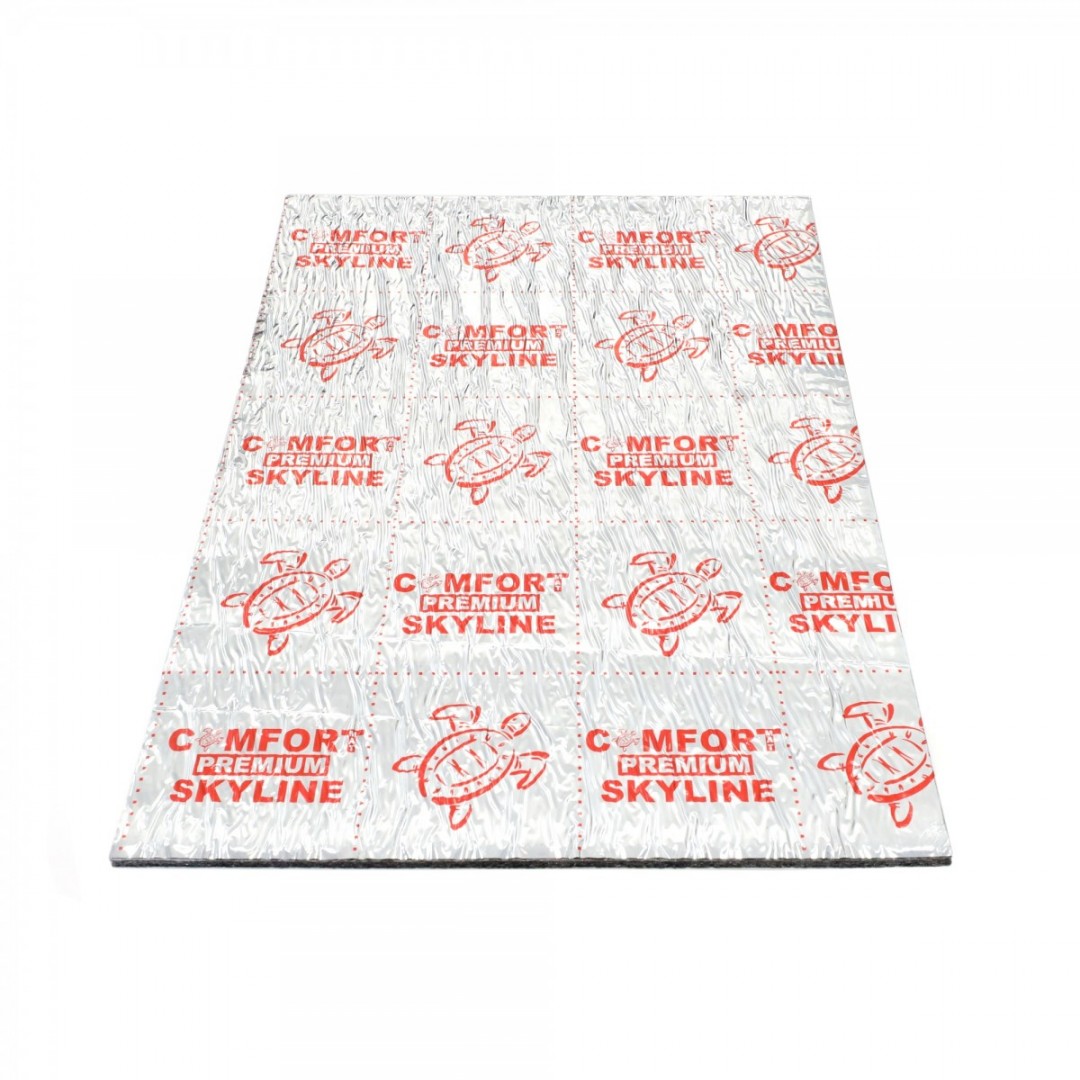 Comfortmat Skyline je špičkový protihlukový materiál z modelové řady Premium navržený zejména pro odhlučnění stropu a kapoty automobilu. Jedná se o unikátní třívrstvý tlumicí materiál, který kombinuje zvukově i tepelně izolační funkci díky své vícevrstvé struktuře. Je tvořen jedinečnou zvukotěsnou membránou o tloušťce 1 mm, tepelně i zvukově izolační vrstvou o tloušťce 5 mm. Důležitou součástí materiálu je i nejnovější generace moderního montážního lepicího tmelu vyvinutého pro sezónu 2018/2019, který zaručuje stejný lepící účinek při teplotách od -50 do +150 stupňů. Lze tedy zaručit, že Skyline se samovolně nikdy neodlepí. Mezi další unikátní vlastnosti patří také váha - jedná se o vůbec nejlehčí protihlukový materiál na trhu, který obsahuje zvukově izolační membránu. Skyline je samozřejmě zcela voděodolný, neabsorbuje vlhkost, nehnije a nerozkládá se. A co je nejdůležitější, Comfortmat Skyline poskytuje vysokou úroveň zvukové izolace a dokáže snížit hluk až o 25 dB.