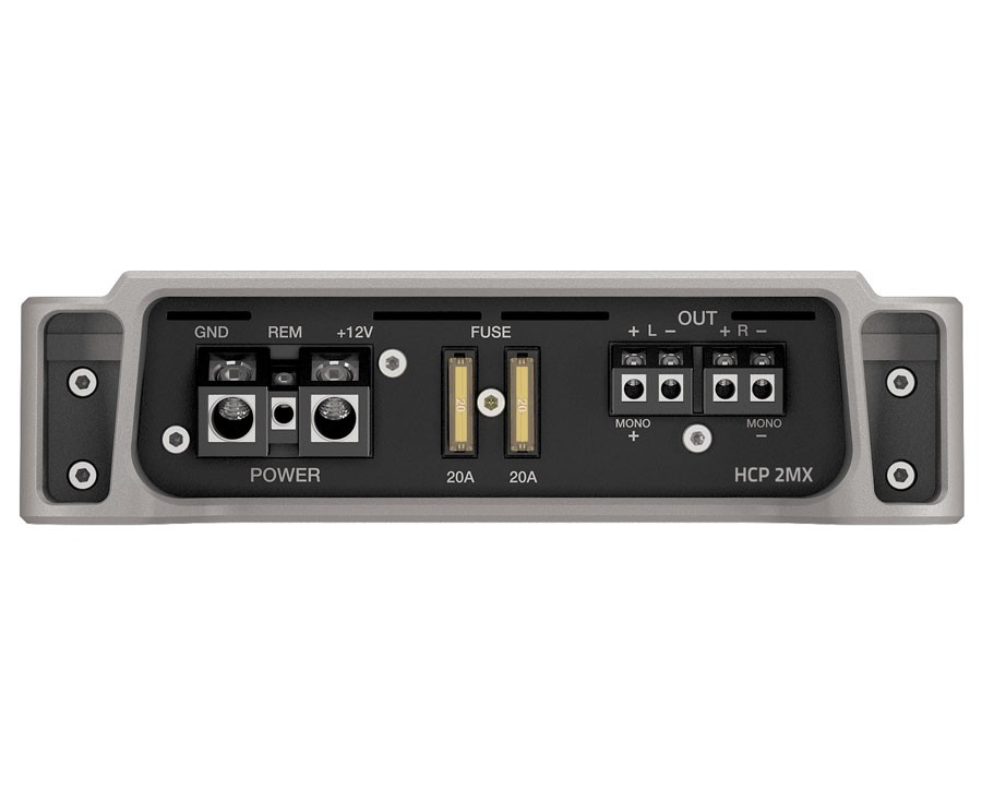 Námořní zesilovač HCP 2 MX se vyznačuje kompaktním designem připraveným čelit prostředí otevřené vody a poskytuje spoustu čisté energie. Chladič HCP M byl vyroben z extrudovaného hliníku, materiálu, který nemá konkurenci pro lehkost, robustnost a odvod tepla. Aby se velikost udržela na minimu, jsou výkonové tranzistory umístěny mezi desku plošných spojů a horní stranu chladiče, kde se shromažďuje teplo. Nahromaděné teplo je pak směrováno do speciálních rozptylových „křídel“ po straně zesilovače. Vstupy Pre-In i Speaker-In mají speciální vyvážený obvod, který zajišťuje vysokou odolnost proti elektromagnetickému rušení pro výsledky bez šumu. Dělicí sekce zesilovačů HCP M zajišťuje extrémní flexibilitu: plně nastavitelné Lo-pass, Hi-pass filtry s 12 dB/Oct. a 24 dB/říjen sklony podle modelu zesilovače; Bass Boost je také k dispozici pro vylepšení nízkých frekvencí. Přesněji řečeno, HCP 2 MX nabízí Hi-Pass předzesilované výstupy, které umožňují vytvořit pásmovou propust na předním basovém reproduktoru.