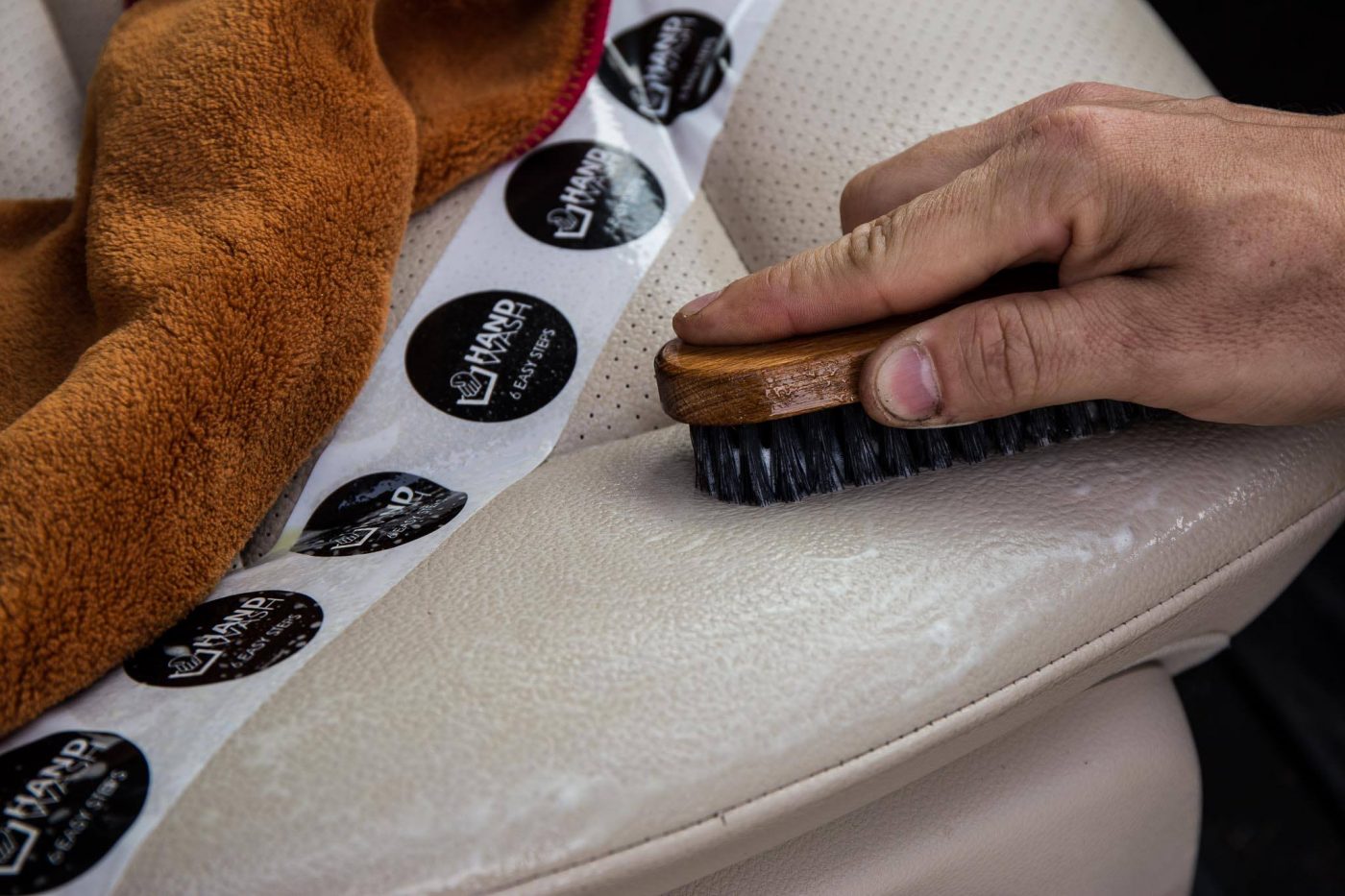 Před použitím LEATHER CLEAN & SOFT / ČIŠTĚNÍ A ZJEMNĚNÍ KŮŽE – vyzkoušejte stálobarevnost kůže vyčištěním části kůže, kterou není vidět! Pokud kůže interiéru automobilu nezmění svou barvu, tvar a jemnost, můžete začít čištění kůže. Pozor! – na opotřebených plochách může způsobit uvolnění barev. Vždy postupujte pouze po malých plochách, neboť v opačném případě může dojít k nerovnoměrnému času působení přípravku a výsledek čištění kůže a čištění koženého čalounění nebude celistvý. Stříkněte na plochu cca 40 x 40cm a stříkněte produkt též na utěrku z mikrovlákna , kterou pak plochu vyčistěte. Takto vyčistěte kompletní kožené čalounění – sedadla, dveřní čalounění a v některých případech přístrojovou desku. V případě silného znečištění použijte kartáček na kůži anebo mikrohoubu na kůži. Pak přistupte ke kroku impregnace kůže produktem LEATHER PROTECT / IMPREGNACE KŮŽE.