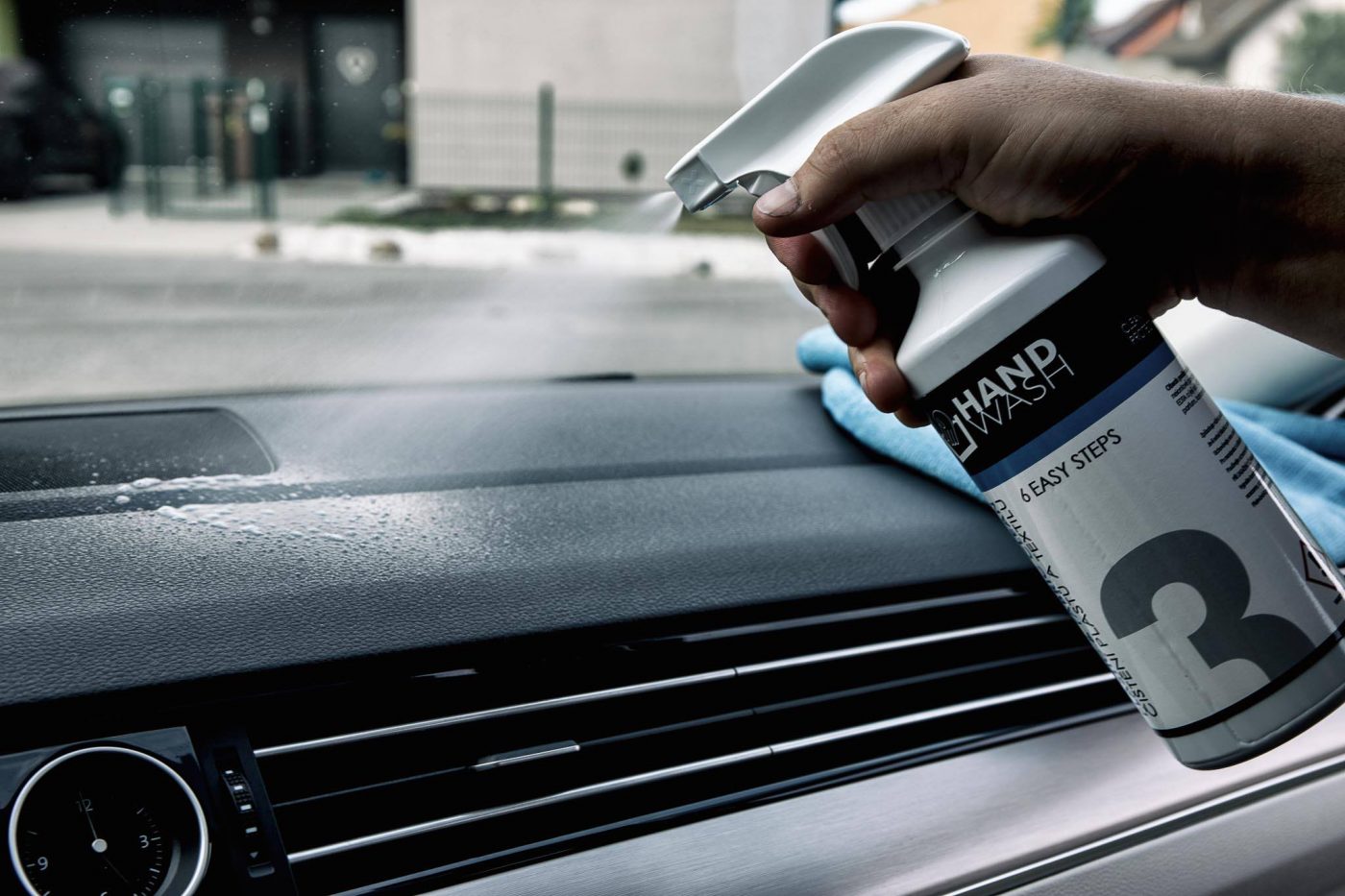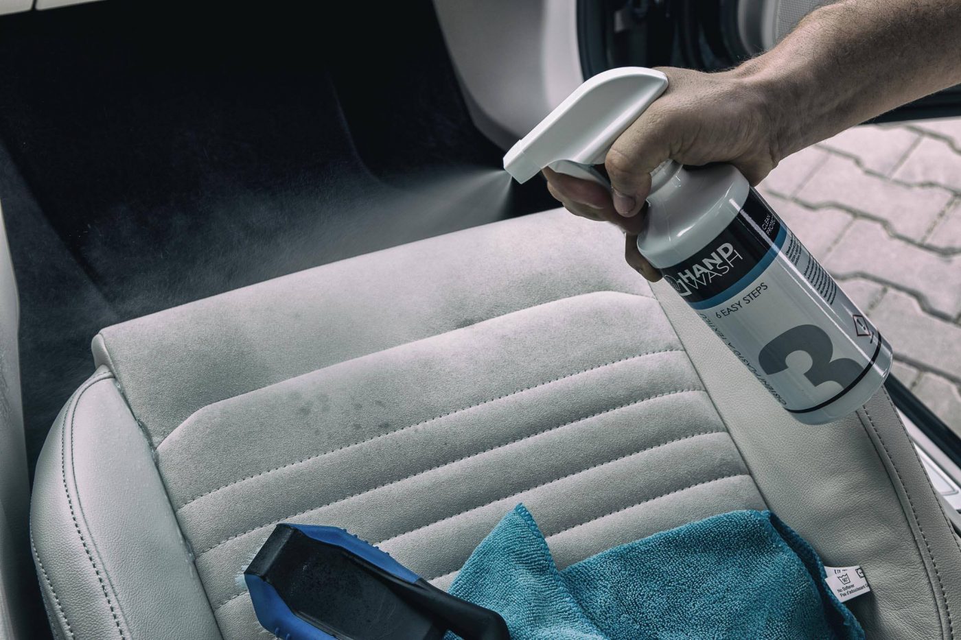 Třetí krok při ručním čištění automobilu je čištění a tepování interiéru za pomoci přípravku PLASTIC & FABRIC CLEAN / ČIŠTĚNÍ PLASTŮ A TEXTILU.