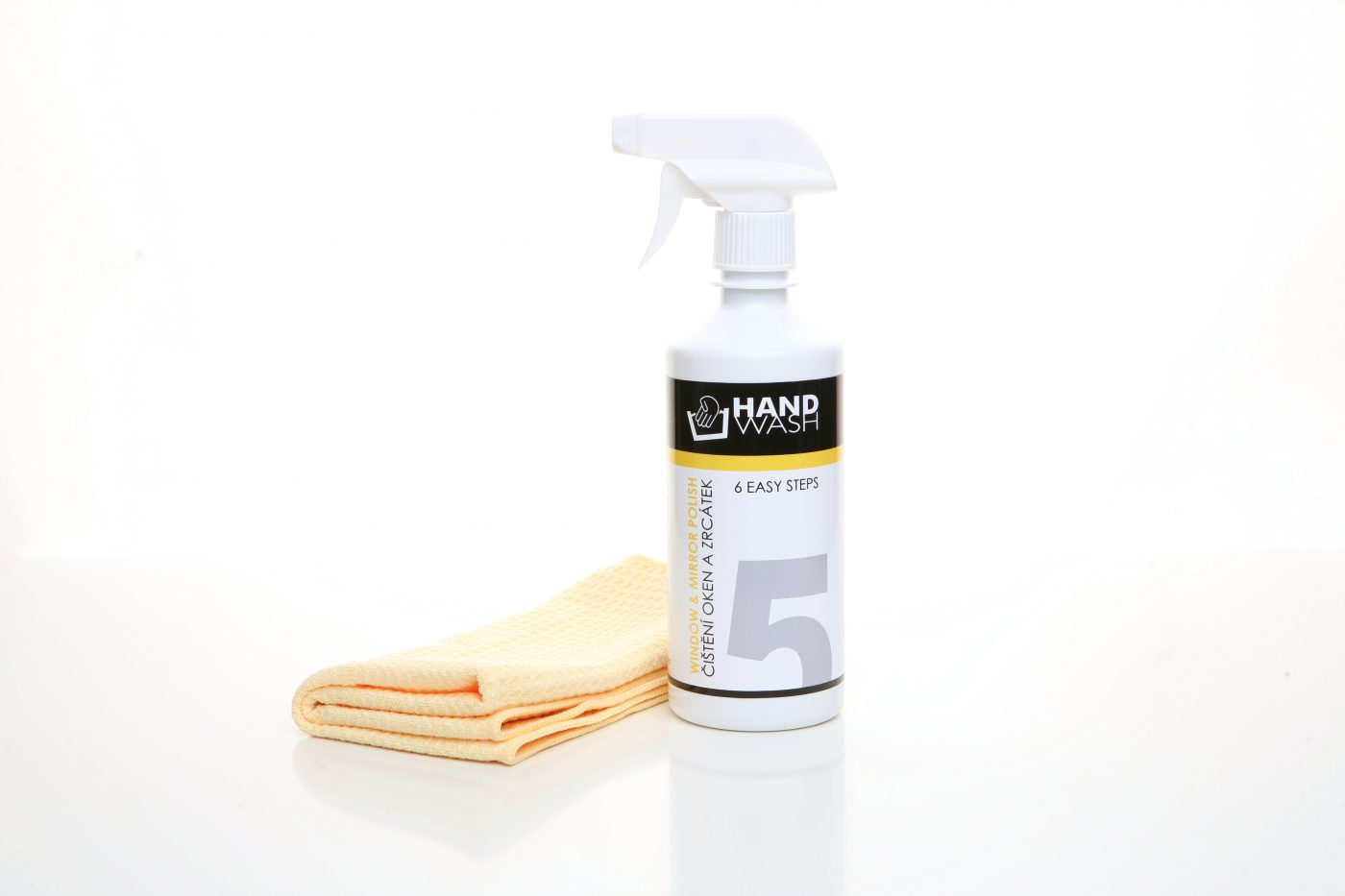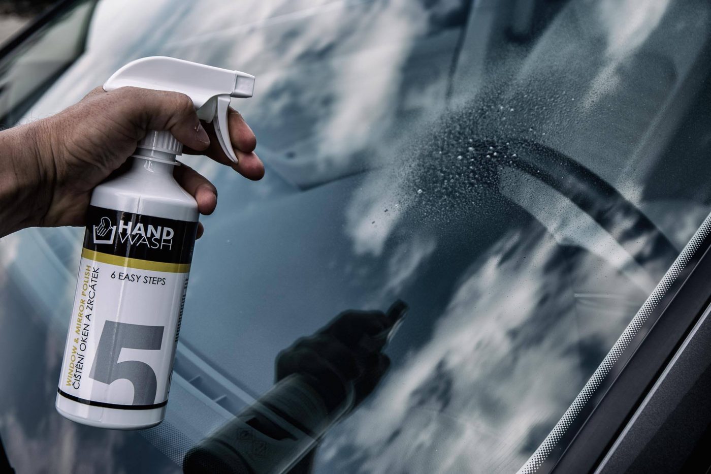 Pátý krok při čištění automobilů je čištění oken a čištění zrcátek za pomoci přípravku – WINDOW & MIRROR POLISH / ČIŠTĚNÍ OKEN A ZRCÁTEK.