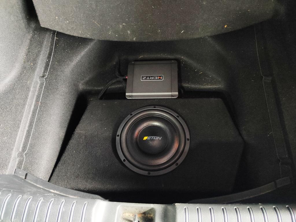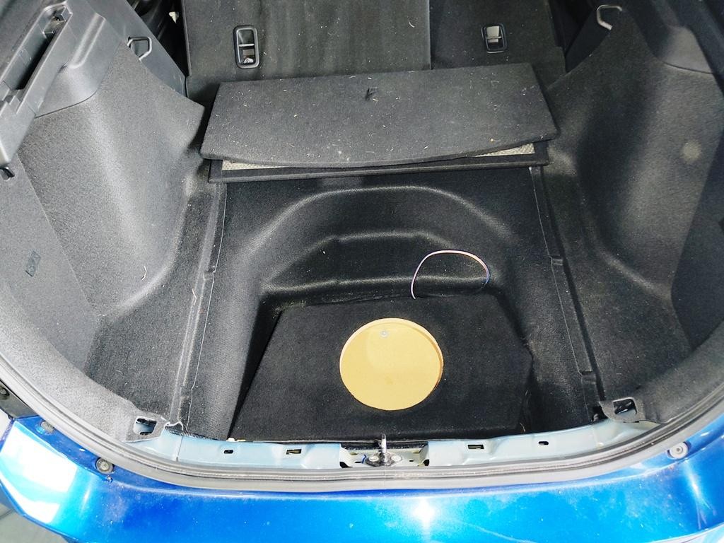 Instalace skrytého subwooferu do dvojité podlahy Hondy Civic 10. generace a přímé napojení na stávající audio systém. V tomto případě měl zákazník jasnou představu o tom co do vozidla chce doinstalovat. Jednalo se o instalaci subwooferu, přičemž se musela zachovat ložná plocha zavazadelníku. Z tohoto důvodu jsme zvolili umístění na dno kufru pod dvojitou podlahu, kde je ovšem montážní hloubka pro ozvučnici pouhých 10cm. Upravili jsme tedy na míru MDF ozvučnici s nízkou montážní hloubkou tak, aby se vešla do prostoru dna kufru, kde pro její upevnění posloužil předpřipravený závit pro dodatečně vložené rezervní kolo. Pří úpravě byl kladen důraz na zachování vhodného objemu ozvučnice pro zvolený reproduktor. Úpravou ozvučnice prošla i přední strana, která nyní slouží pro upevnění mono zesilovače. Díky tomu nebylo potřeba do vozu vůbec vrtat a vytvářet montážní prvky pro komponenty. Velmi nízkou ozvučnici jsme vystlali akustickým rounem a osadili "flat plochým" subwooferovým reproduktorem Eton Move M10, který má výkon 300W RMS, průměr 10" (250mm) a disponuje dvěma cívkami o impedanci 2 Ohmy.