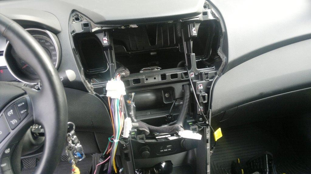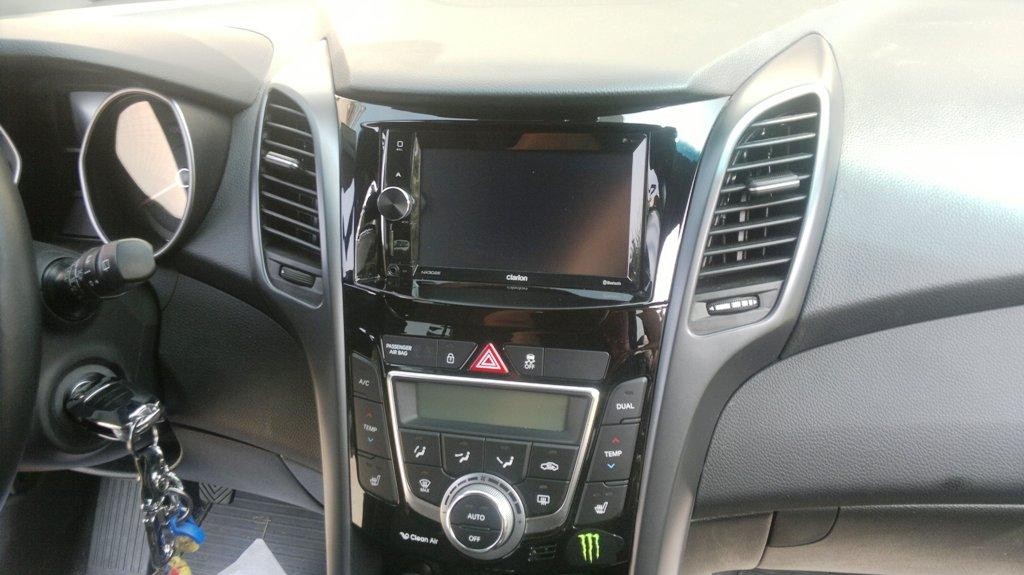 Provedli jsme montáž 2DIN multimediální jednotky s GPS Clarion NX302E a parkovací kamery do Hyundaie i30. Originální rádio jsme nahradili multimediální jednotkou od Clarionu, která díky jednoduchému designu vypadá v lakovaném rámečku pro Hyundai velmi elegantně. Dobře zvolený adapter zaručuje komunikaci s tlačítky na volantu a podporu CAN BUS informací. Původní slot pro USB jsme přestrojili na adapter pro aftermarketová rádia, tak že připojení AUX a USB zůstává po ruce v původní pozici. GPS anténa pro navigaci iGO primo je připevněna na "A" sloupku v místě s maximálním příjmem. Dále jsme do osvětlení SPZ nainstalovali parkovací kameru, která je zobrazována automaticky po zařazení zpátečky. Jednotku jsme po té naladili na optimální vyváženost s originálními reproduktory a celou ji nastavili k okamžitému použití tak, aby zákazník nemusel do nastavení zasahovat. Celkový design přístrojové desky vypadá doslova famózně a spokojenost zákazníka byla tak na místě.
