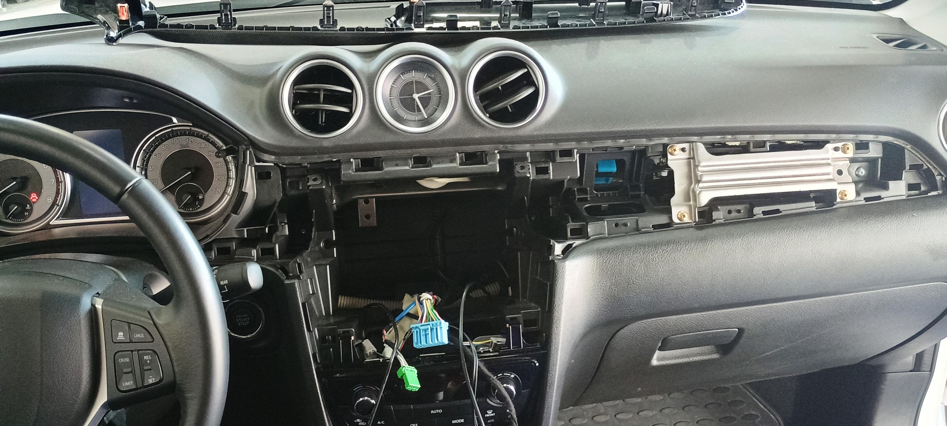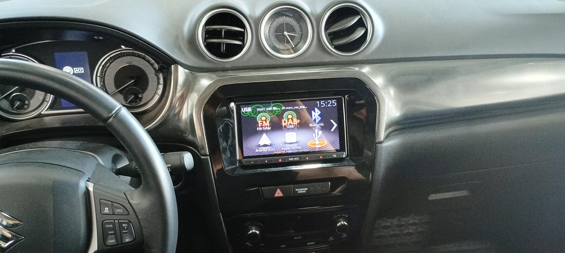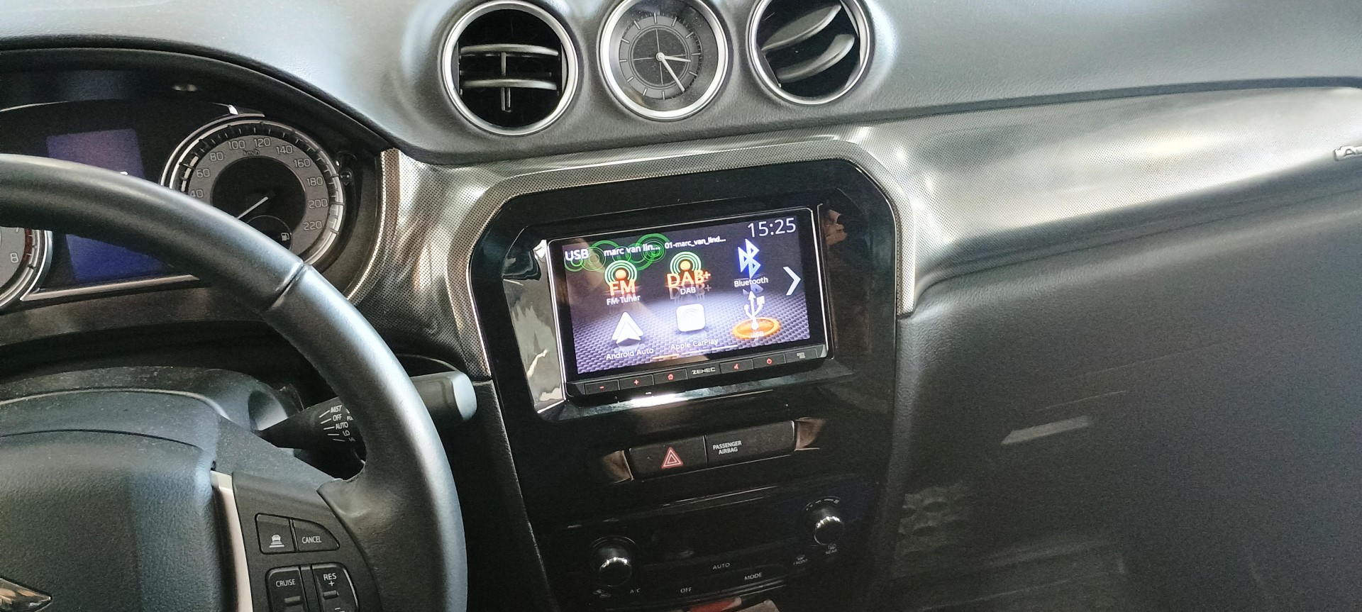 Instalace multimediální jednotky s Android Auto, Carplay a montáž parkovací kamery do vozidla Suzuki Vitara III. Zvolili jsme oblíbené multimedium Zenec Z-N528, které jsme osadili do černě lakovaného rámečku, který perfektně padne do interiéru vozu. Vhodně zvolený adapter zachoval funkci multifunkčního volantu pro pohodlné ovládání rádia a telefonu. Dalším požadavkem bylo naistalování parkovací kamery, kterou jsme umístili do lišty pátých dveří. Širokoúhlá kamera perfektně zobrazuje kompletní prostor za autem a díky tomu je parkování bezpečnější.