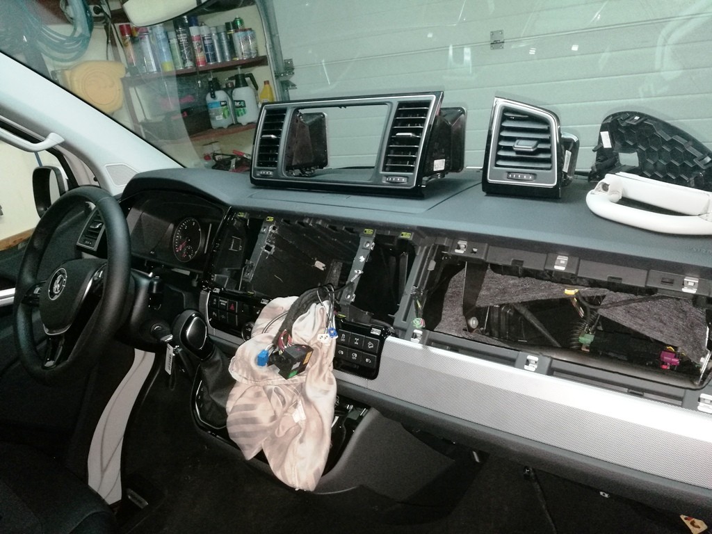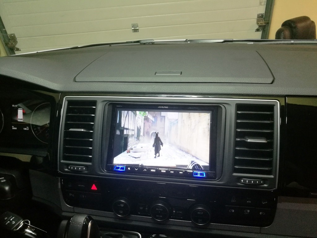 Aktuálně jsme dokončili práce na multimedializaci zcela nového VW MULTIVAN T6. O zábavu na zadních sedadlech se stará 15" stropní monitor Ampire, který je připojen k televiznímu tuneru LOGIC DVB-T2 pomocí HDMI. Připojení externího DVB-T využívá i nová 8" multimediální jednotka Alpine X802D-U, která pomocí adaptéru dokonale zobrazuje palubní informace a komunikuje s originálním maxidotem vozidla. Navigaci, telefon, nebo seznam můžete sledovat na maxidotu, přičemž na hlavní jednotce běží film. Jako první jsme navíc dokázali implementovat originální MIB kameru do neoriginální jednotky a tak lze zobrazení originální kamery, nebo parkovacích senzorů jednoduše přepínat na hlavní jednotce Alpine, nebo zvolit duální režim.